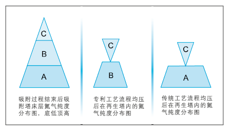 該流程對傳統工藝流程下均壓位置作了改進。提高了氮氣回收率和碳分子篩利用率,降低了能耗,改變了利用變壓吸附不能制取高純氮氣(99.9995%N2)的歷史。
