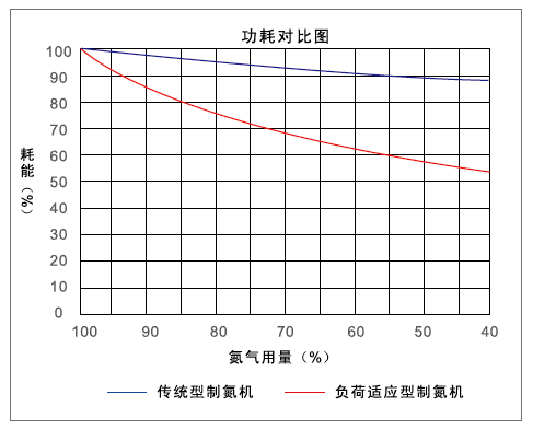 先進的負荷適應功能對變工況運行實現進一步節能 針對用戶用氣不穩定工況,根據分子篩的特性,在保證氧氣性能穩定的情況下,有效減少單位時間內富氮氣體排放次數,減少原料空氣的消耗,減少生產成本,以達到負荷自動適應的節能功能。