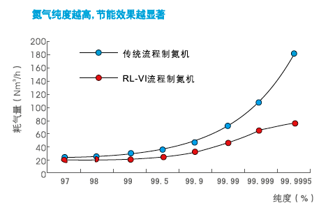 降低原料空氣消耗,確保吸附塔床層氮氣純度分布連續性,提高碳分子篩的產氮效率,改變了利用變壓吸附技術不能制取高純氮氣(99.9995%)的歷史。減輕壓縮空氣凈化單元負載,提高原料壓縮空氣預處理效果,確保碳分子篩性能指標。氮氣純度越高,節能效果越明顯。